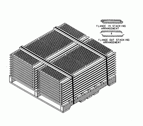 Stack running boards (longest ones first) on the pallet in interlocking, alternating fashion (first one down, second one up, etc.) not to extend beyond the pallet dimension. Two 1″ x 2″ x (v) various boards are placed across the running boards and two .75″ non-metallic bands are used to secure them to a four-way 40″, 42″, or 48″ x 48″ pallet.