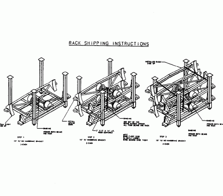 Truck mounted brake systems are packaged in returnable racks as follows: Place first two systems into the rack right side up and place a 1.25″ non-metallic band around both beams and the rack. Place the second two systems in the rack upside down. They are secured with a 1.25″ non-metallic band wrapped around all four beams and the rack. Place the last two beams in the rack right side up. Use two 1.25″ non-metallic bands to secure the ends of the bundle. Band the first side loosely, and the other side tightly. Blocks of wood (2″ x 6″ x 14″), are to be placed on end between the first and second and the second and third systems for stability. Place accessories in a medium burlap bag and attach securely to each system.