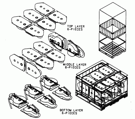Place two rows of three handbrakes per row face up in a crate. The rows face in opposite directions with the gear ends of the 6 handbrakes facing inward. Two handbrakes are placed vertically on their sides, facing inward, at opposite sides of the crate with their gear ends facing one another. Four handbrakes are then placed in the center of the crate, face down with their gear ends toward one another. The middle layer consists of 6 handbrakes which are placed face down with their gear ends toward the center of the crate for a total of 20. Chains must be taut and secured to the lever of each handbrake by either looping the trailing link over it or by attaching with a twist tie. Fasteners must be placed in a bag and be attached to each handbrake. If a lid is used, it is secured to the package with two .5″ non-metallic bands.