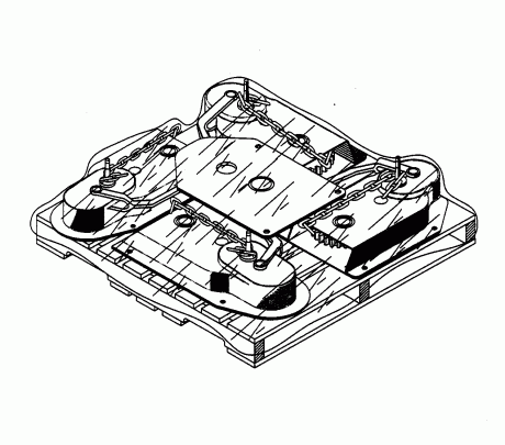 Four handbrakes are placed in a “pinwheel” fashion, shaft up on a pallet. One additional unit is placed shaft down in the center of the first layer for a total of five handbrakes. The brake levers should face inward and must not extend beyond the perimeter of the pallet. Chains must be taut and secured to the lever of each handbrake by either looping the trailing link over it or by attaching with a twist tie. The handbrake nut and cotter key are attached to each shaft while the clevis and rivet must be placed in a bag which must then be attached to each of the handbrakes.