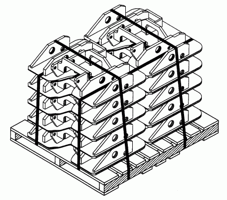 Place up to ten hitch heads face down in two stacks of five heads each on a 40″ x 48″ pallet. Some heads may need to be further stabilized by placing up to two 4″ x 4″ wooden blocks and possibly a 2″ x 4″ board between each of the first four heads in the package (total of 8 blocks and/or 4 boards). The pieces are attached to the pallet with two 1.25″ non-metallic bands across both stacks and one 1.25″ non-metallic band placed perpendicular to the first two per sack, for a package total of four non-metallic bands.