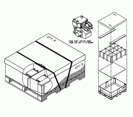 Place one emergency portion on its side in each of nine partition cells in a water-resistant crate with lid. All valve openings must be protected with a temporary plastic cover. The customer may specify that the center cell be left empty thereby reducing the quantity to 8 and the weight by about 60 pounds. Packaging items in this fashion would eliminate the need to reach to the center of the crate for a part.